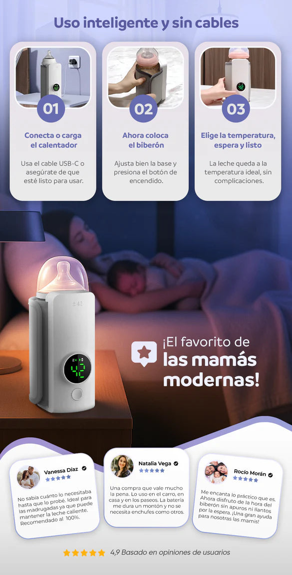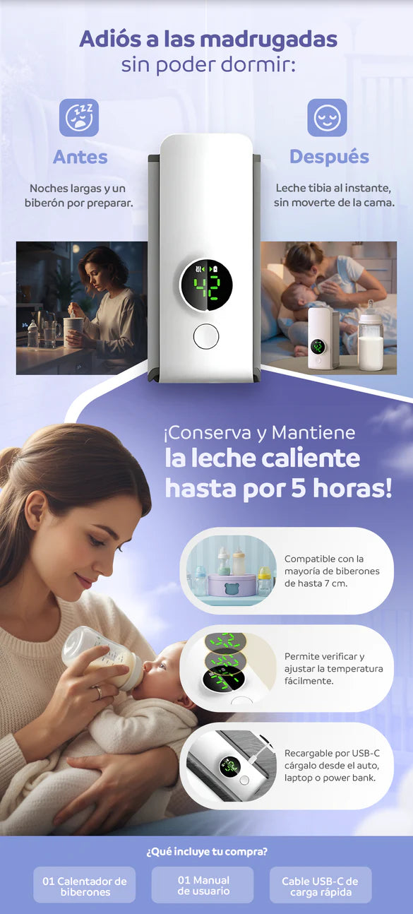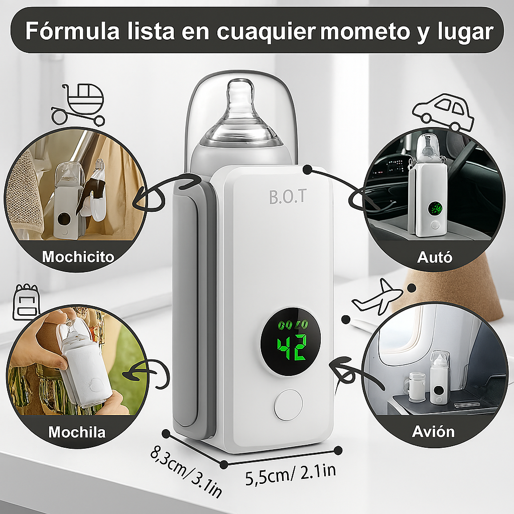 Nuestro calentador es compatible con la mayoría de biberones estándar de vidrio y plástico. Si usas un modelo específico, consúltanos y te confirmamos.